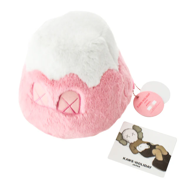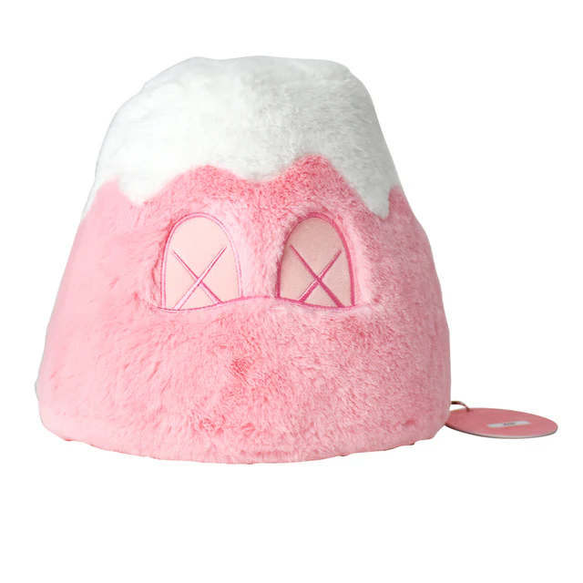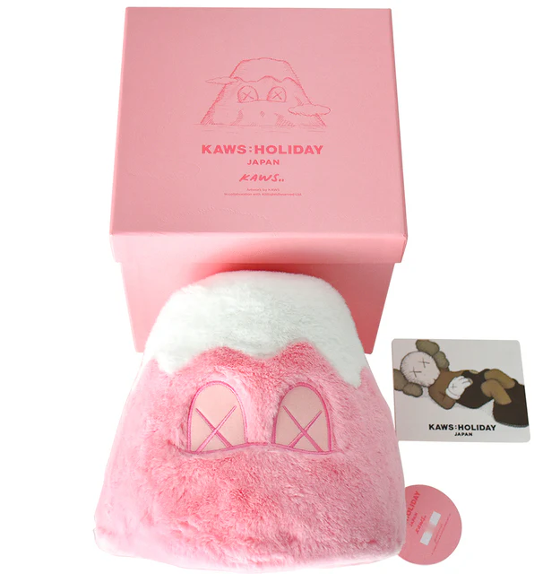 Publié pour l’exposition extérieure Kaws au Mont Fuji au Japon. Peluche douce du mont. Fuji et rose. Emballé dans une boîte rose imprimée personnalisée avec des cartes d’informations.